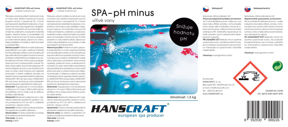 Pro největší působení chloru bez vedlejších vlivů je nutno upravit hodnotu pH vody na 6,8-7,6. Při hodnotách nad 7,6 se ve vodě mohou vyskytovat zákaly, které následně způsobí ucpání filtru. dále se může snížit účinnost dezinfekčních přípravků, cítíte silný zápach po chloru, dále může dojít k podráždění očí a pokožky. V tomto případě je nutné pro úpravu vody a snížení hodnoty pH použít přípravek HANSCRAFT SPA pH minus.